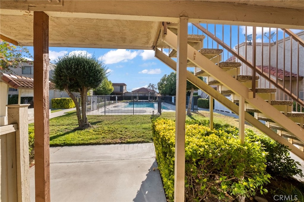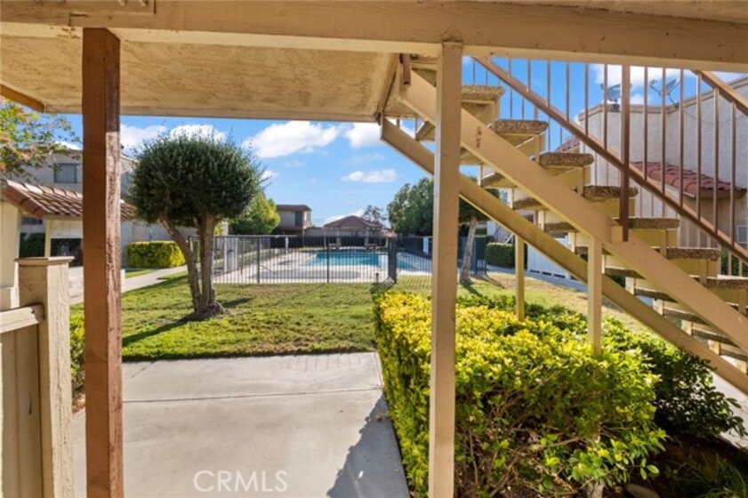 HUGE PRICE IMPROVEMENT!! BEST PRICED CONDO IN THE DEVELOPMENT!! INVESTOR OPPORTUNITY!! Charming 2 bedroom 2 bathroom condominium located just steps from the sparkling pool! Conveniently located in the gated community of Acacia Gardens in West Hemet. Low HOA includes water and trash. This is a great lower unit with a large front porch and offers a detached two-car garage. Walking up to the home you enter into the spacious and open living room with a seamless flow from the living room to the dining room to the kitchen. The living room features updated laminate wood flooring, which is featured throughout the entire home, a neutral paint scheme, and a sliding door leading to the front porch while also welcoming an abundance of natural light into the home. The kitchen is nice-sized and open with plenty of cabinets for storage and counter space. There is a full-size free-standing gas range with a burner stove and oven, stainless steel appliances, range hood, and opens to the dining area. There is a short hallway off the living room which leads you to the bedrooms, bathrooms, and laundry. The primary bedroom is at the end of the hall on the left, featuring a ceiling fan, a large window allowing plenty of natural light to fill the room, two separate closets with mirror doors, and an attached bathroom with a single vanity sink and a walk-in shower. The secondary bedroom offers a ceiling fan and a good-sized closet with mirrored doors and plenty of natural light. The hallway bathroom has a shower and tub combination, a single vanity sink, and ample linen storage. The charming Acacia Gardens community offers amenities such as a swimming pool, spa courtyard area, and gazebo and is conveniently located just a short distance from Hemet Valley Mall, freeways, schools, restaurants, Seven Hills Golf Club, Diamond Valley Lake, and much more! Hurry and make your appointment today!