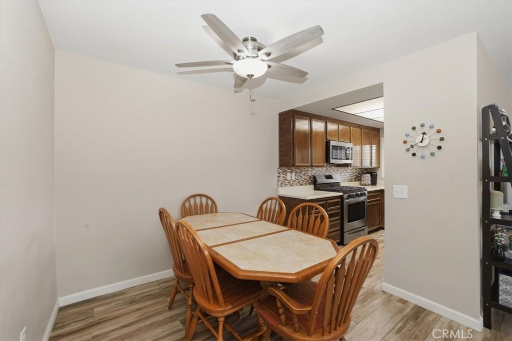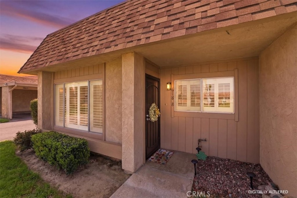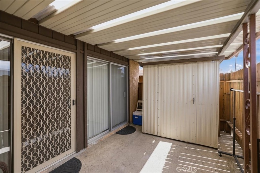 Enjoy comfortable single-story living in the established Sunrise Village 55+ Community. This 2-bedroom, 2-bath home offers a bright, functional layout designed for easy, low-maintenance living. Situated in a desirable end-unit location, the home shares only one direct neighboring residence, offering added privacy along with a pleasant courtyard view. The main living areas feature porcelain tile flooring with a wood-grain finish, plantation-style shutters, and abundant natural light. Both bedrooms include soft carpet for added comfort and sliding glass doors that open directly to the private patio. The patio provides outdoor space and includes a storage shed, offering convenient room for tools, seasonal items, or extra storage. Additional features include in-unit stackable laundry, ample interior storage, and two assigned carport parking spaces. Residents of Sunrise Village enjoy access to community amenities including a pool, spa, shuffleboard area, courtyard, and clubhouse, while the HOA covers water, trash, and landscaping. Conveniently located near shopping, dining, medical services, and everyday essentials, this home offers a comfortable setting within a well-established 55+ community.
